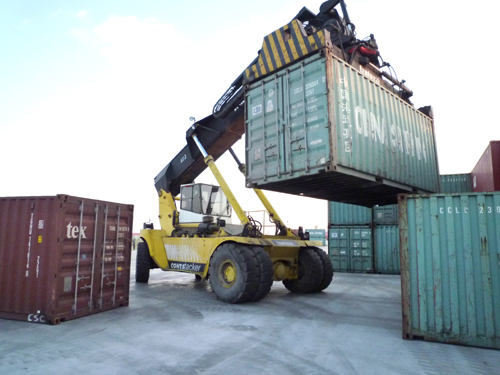 圖為集裝箱貨運(yùn)中心正將北大荒大米裝箱發(fā)運(yùn)。