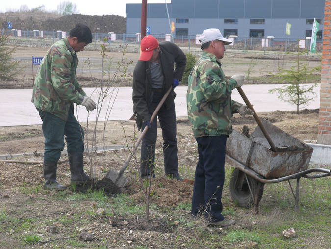 圖片新聞:虎林北大荒米業(yè)廠區(qū)環(huán)境特殊,離鐵路沿線只有50米,垃圾較多,為創(chuàng)造良好的廠區(qū)環(huán)境,他們組織各科室人員對廠區(qū)院內(nèi)垃圾死角進(jìn)行全面清理,清理白色垃圾、清掃枯葉垃圾,美化廠區(qū)環(huán)境。利用閑置空地植栽樹木,目前已有丁香花100余株,果樹500余株。 圖為員工們正在栽植樹木。