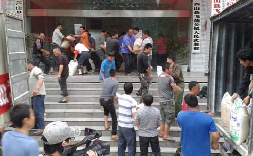 北大荒來了!”4月27日18時10分,一隊裝滿6萬斤北大荒大米的5輛專用運(yùn)輸車,抵達(dá)距震中13公里,80%房屋倒塌的蘆山縣飛仙關(guān)鎮(zhèn)。