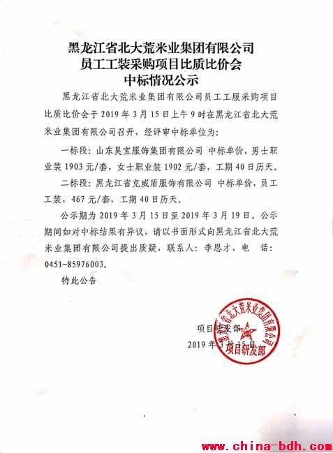 北大荒米業(yè)員工工裝采購項(xiàng)目比質(zhì)比價(jià)會(huì)中標(biāo)情況公示