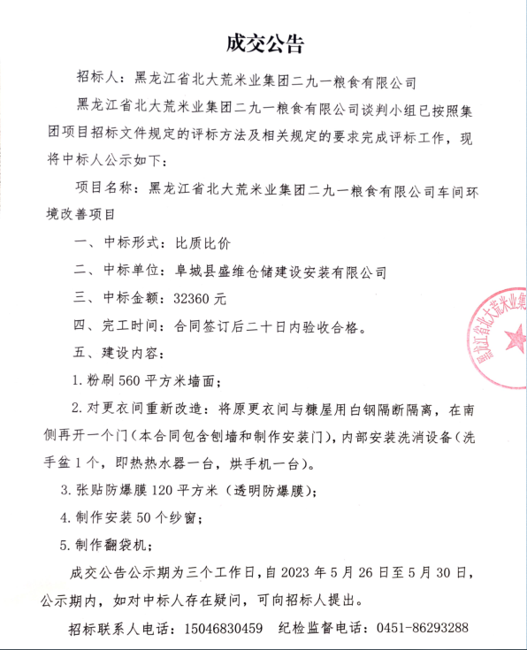 黑龍江省北大荒米業(yè)集團(tuán)二九一糧食有限公司車間環(huán)境改善項(xiàng)目成交公告
