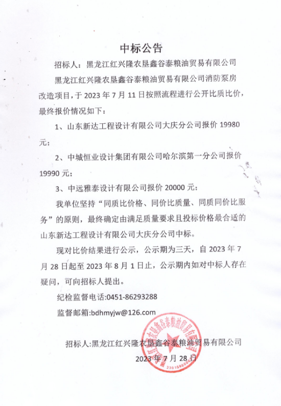 黑龍江省紅興隆農(nóng)墾鑫谷泰糧油貿(mào)易有限公司消防泵房改造項(xiàng)目中標(biāo)公告