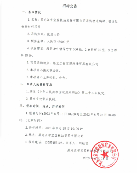 黑龍江省寶盟糧油貿(mào)易有限公司采購(gòu)改造爬梯、增設(shè)過橋梯材料項(xiàng)目招標(biāo)公告