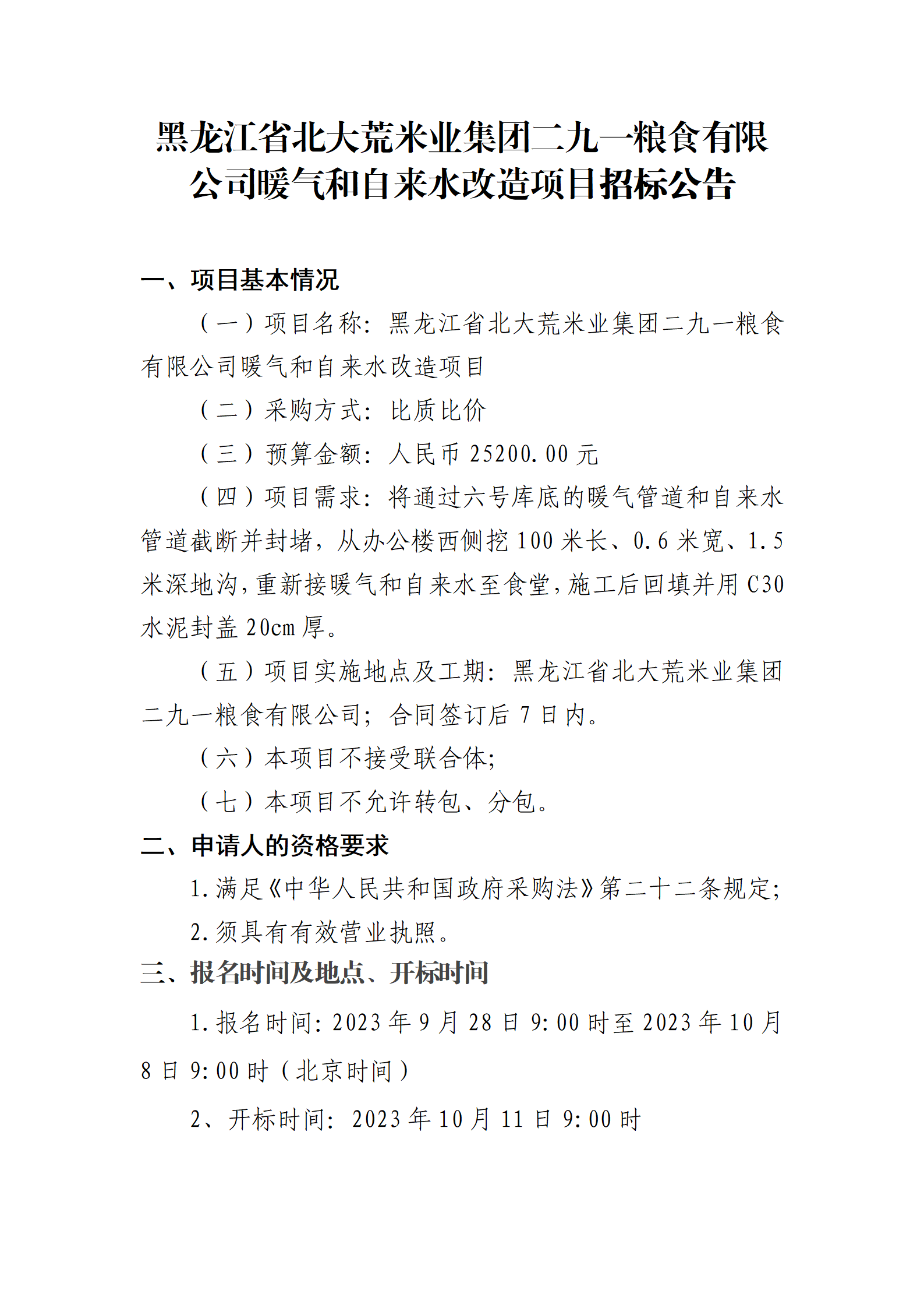 黑龍江省北大荒米業(yè)集團二九一糧食有限公司暖氣和自來水改造項目招標公告