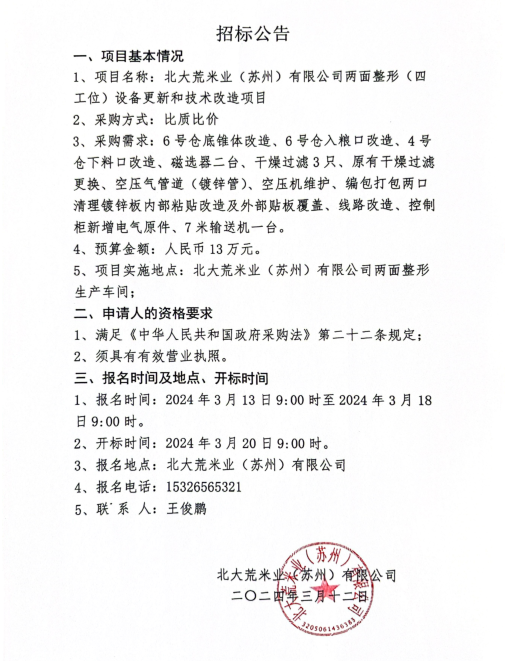 北大荒米業(yè)(蘇州)有限公司兩面整形(四工位)設(shè)備更新和技術(shù)改造項目招標公告
