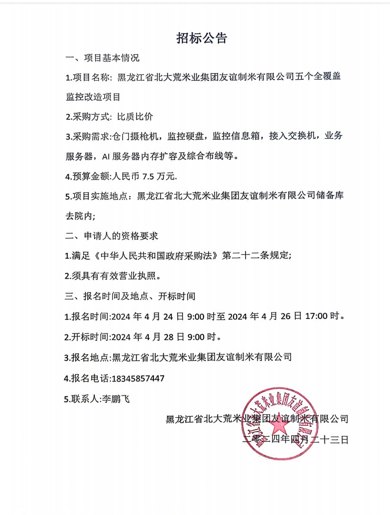 北大荒米業(yè)友誼公司五個全覆蓋監(jiān)控改造項目招標(biāo)公告