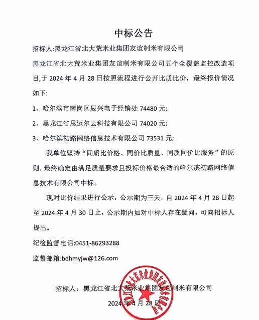 北大荒米業(yè)友誼公司五個全覆蓋監(jiān)控改造項目中標公告