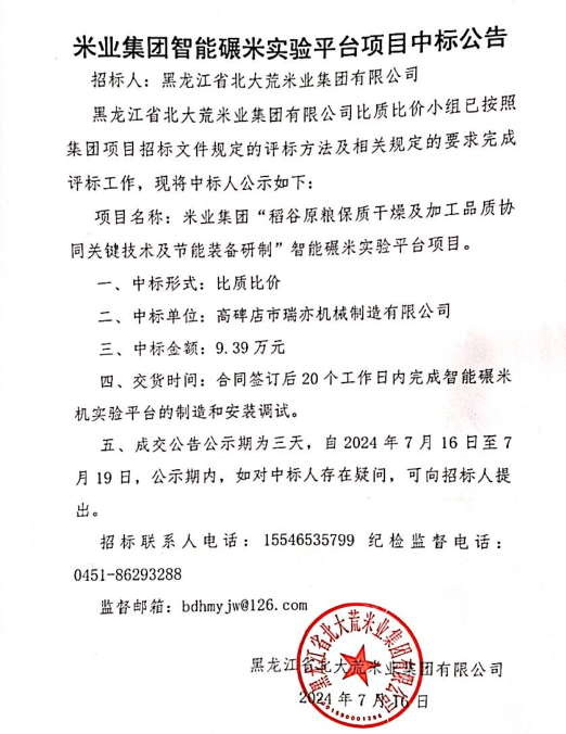 米業(yè)集團智能碾米實驗平臺項目中標公告