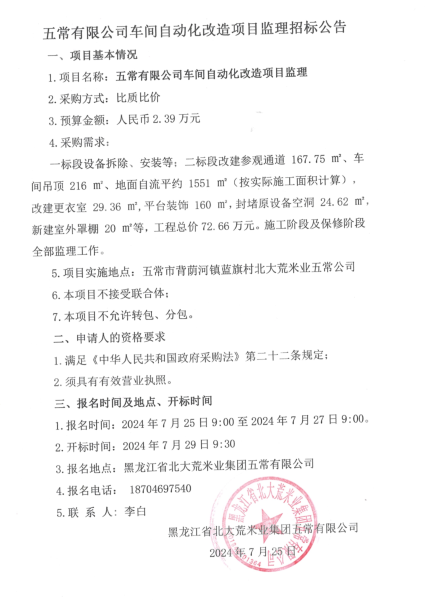 五常有限公司車(chē)間自動(dòng)化改造項(xiàng)目監(jiān)理招標(biāo)公告