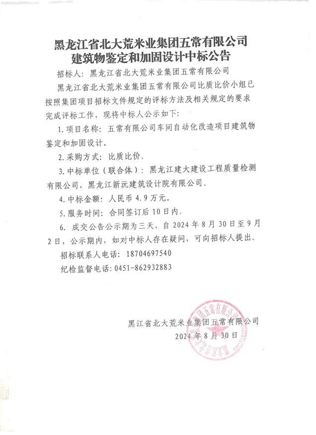 北大荒米業(yè)五常公司建筑物鑒定和加固設計中標公告