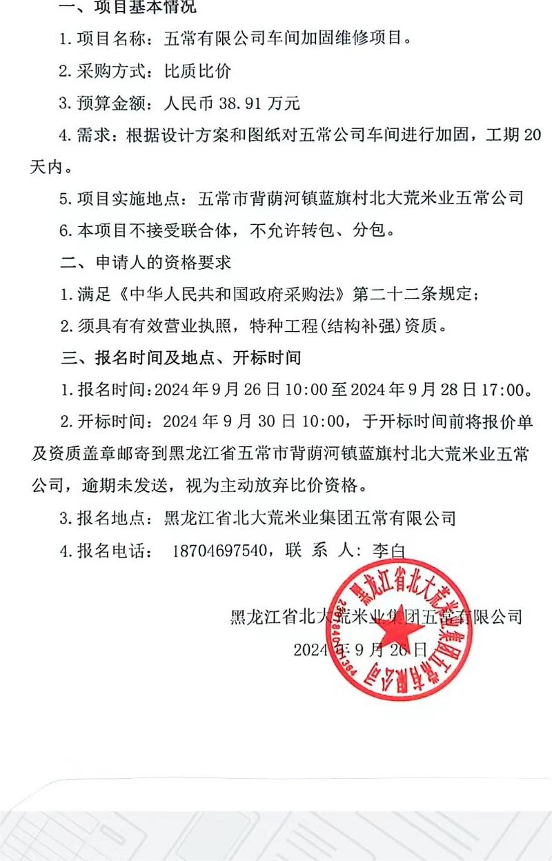 北大荒米業(yè)五常公司車間加固維修項(xiàng)目招標(biāo)公告