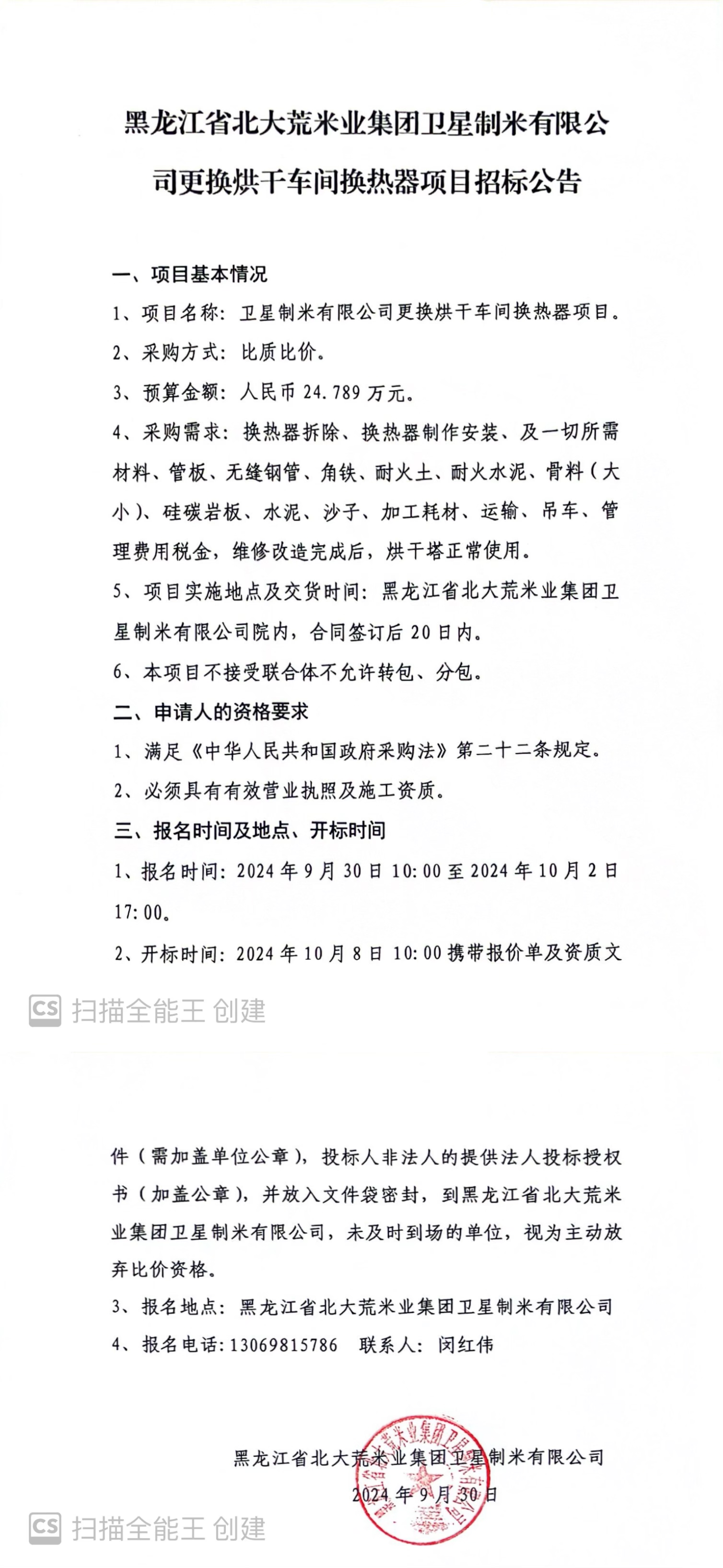 衛(wèi)星制米有限公司更換烘干車間換熱器項(xiàng)目招標(biāo)公告