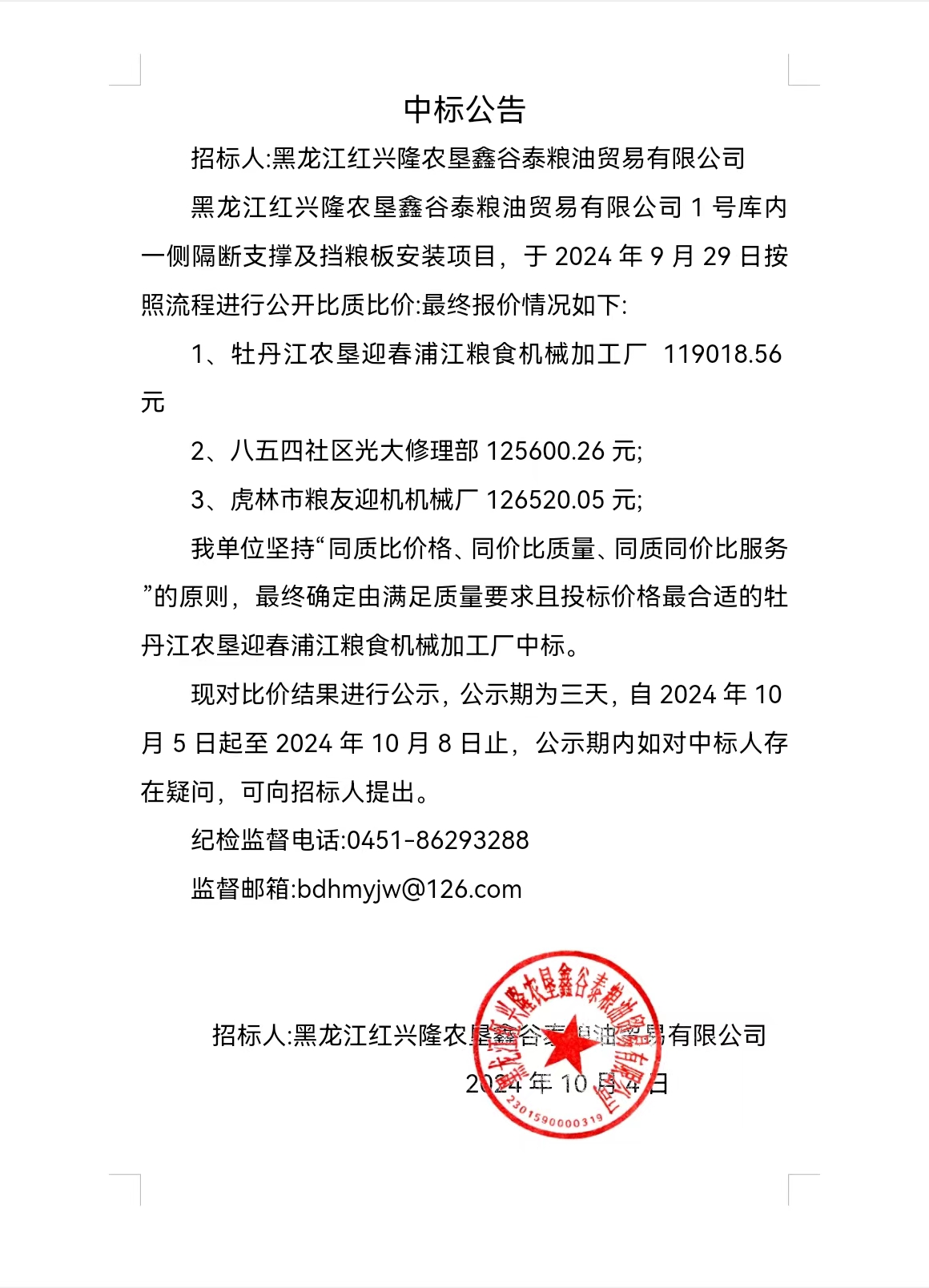 鑫谷泰糧油公司1號庫隔斷支撐及擋糧板項(xiàng)目中標(biāo)公告