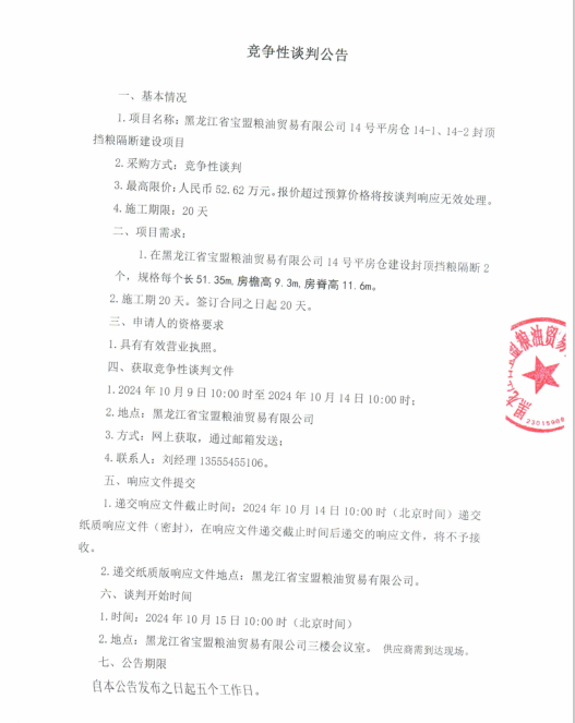 黑龍江省寶盟糧油貿(mào)易有限公司14號(hào)平房倉擋糧隔斷項(xiàng)目競(jìng)爭(zhēng)性談判公告