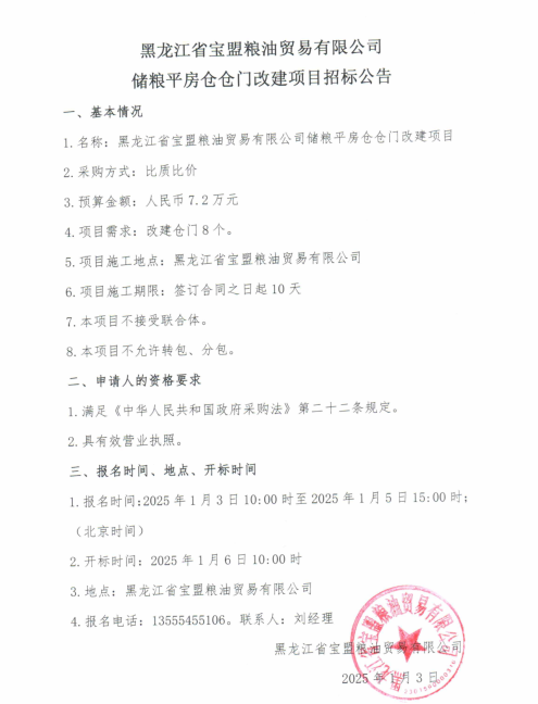 黑龍江省寶盟糧油貿(mào)易有限公司儲(chǔ)糧平房倉(cāng)倉(cāng)門改建項(xiàng)目招標(biāo)公告