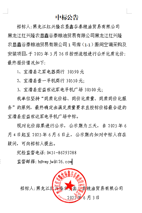 黑龍江紅興隆農墾鑫谷泰糧油貿易有限公司1號庫空調采購及安裝項目中標公告