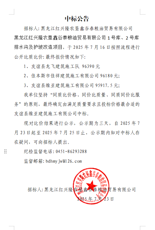 黑龍江紅興隆農(nóng)墾鑫谷泰糧油貿(mào)易有限公司1號庫、2號庫排水溝及護(hù)坡改造項(xiàng)目中標(biāo)公告