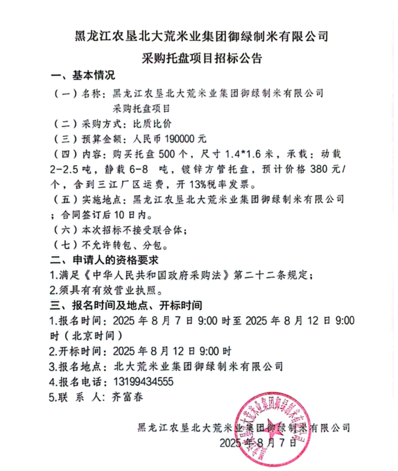 黑龍江省北大荒米業(yè)集團(tuán)御綠制米有限公司采購(gòu)?fù)斜P(pán)項(xiàng)目招標(biāo)公告