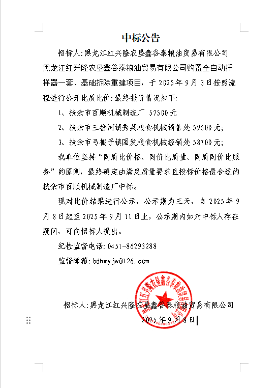 鑫谷泰糧油貿(mào)易有限公司購置全自動(dòng)捍樣器一套、基礎(chǔ)拆除重建項(xiàng)目中標(biāo)公告