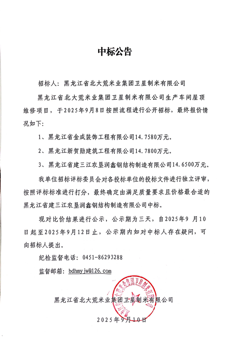 衛(wèi)星制米有限公司生產(chǎn)車間屋頂維修項目中標公告