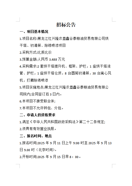 鑫谷泰糧油貿(mào)易有限公司烘干塔、初清篩、除銹噴漆項目招標公告