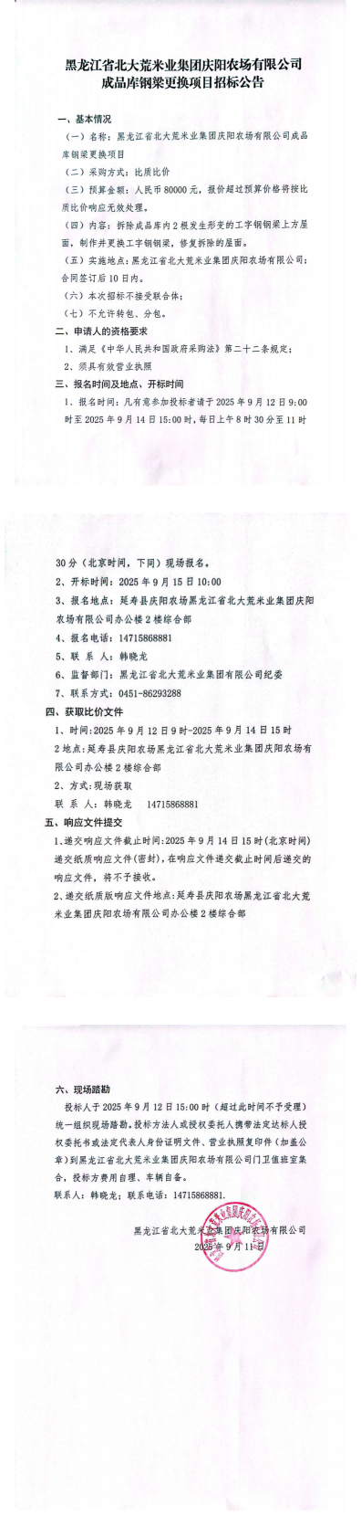 黑龍江省北大荒米業(yè)集團(tuán)慶陽(yáng)農(nóng)場(chǎng)有限公司成品庫(kù)鋼梁更換項(xiàng)目招標(biāo)公告