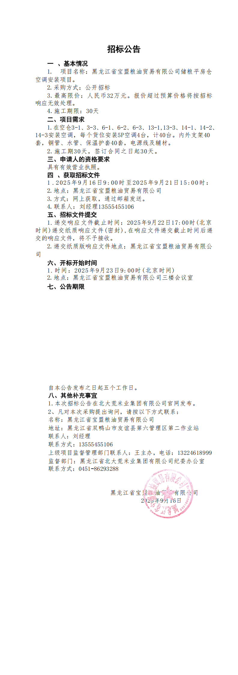 黑龍江省寶盟糧油貿(mào)易有限公司儲糧平房倉 空調(diào)安裝項目招標公告