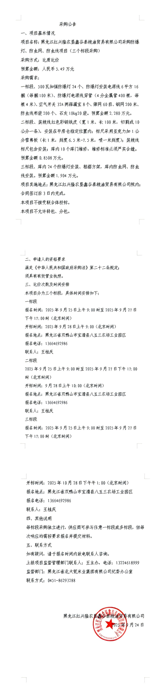 鑫谷泰糧油貿(mào)易有限公司采購防爆燈、防蟲網(wǎng)、防蟲線項目采購公告