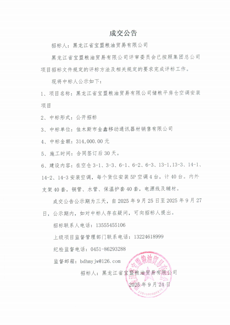 黑龍江省寶盟糧油貿(mào)易有限公司儲糧平房倉空調(diào)安裝項(xiàng)目中標(biāo)公告