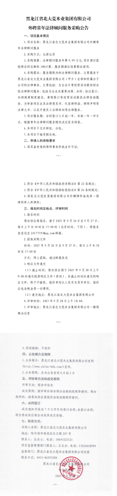 黑龍江省北大荒米業(yè)集團有限公司外聘常年法律顧問服務采購公告